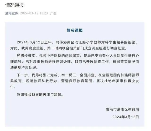 ·廣西通報(bào)“小學(xué)教師扇打拖拽學(xué)生”:屬實(shí),對(duì)涉事教師停課處理。