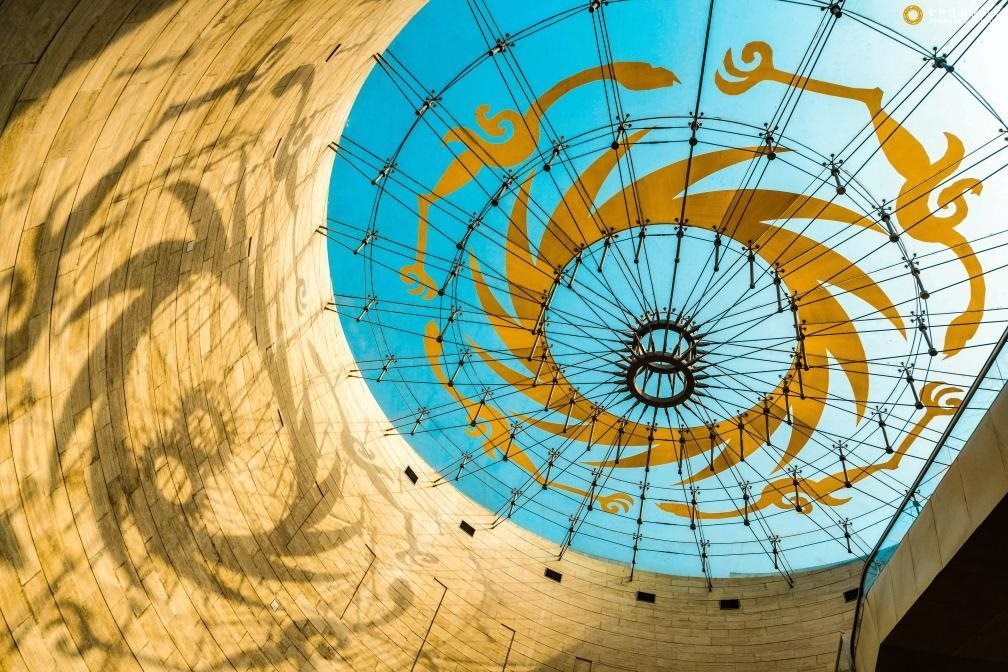 這是陽光透過成都金沙遺址博物館陳列館穹頂,在墻壁上投下太陽神鳥造型的影子(2022年3月10日攝)。新華社發(fā)(張艷攝)