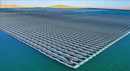 位于寧夏靈武市的國家能源集團寧夏電力公司寧東電廠3×5.98兆瓦漂浮分布式光伏發(fā)電項目(2022年6月17日攝)王鵬攝/本刊