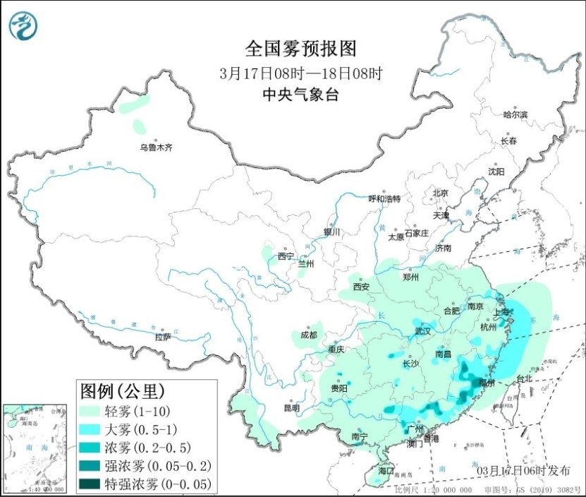 今晨,江蘇、上海、浙江南部、江西中部、福建、廣東、廣西北部、貴州中部等地部分地區(qū)出現(xiàn)大霧天氣,局地能見度不足200米。預(yù)計(jì)今天上午,上述地區(qū)的大霧天氣還將持續(xù),局地有能見度不足200米的強(qiáng)濃霧。此外,黃海南部海域、東海偏西海域、臺(tái)灣海峽將有能見度不足10公里的霧,其中東海西部海域、長江口附近海域、杭州灣附近海域、浙江沿岸海域、福建北部沿岸海域?qū)⒂心芤姸炔蛔?公里的大霧。中央氣象臺(tái)今晨繼續(xù)發(fā)布大霧黃色預(yù)警。