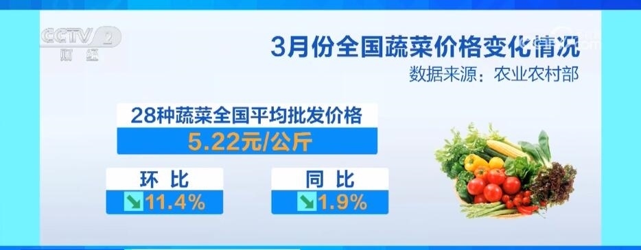 3月份,農(nóng)業(yè)農(nóng)村部監(jiān)測的28種蔬菜全國平均批發(fā)價格為每公斤5.22元,環(huán)比下降11.4%,同比下降1.9%。分品種看,23種蔬菜價格環(huán)比下降,5種上漲,其中降幅較大的品種有菠菜、黃瓜、生菜和青椒。