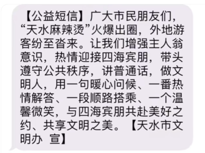 事實上,自3月以來天水在網(wǎng)絡(luò)“出圈”后,游客就絡(luò)繹不絕。有多位當(dāng)?shù)鼐W(wǎng)友“曬”的消息顯示,3月20日收到天水市發(fā)布的“公益短信”,建議當(dāng)?shù)厥忻瘛霸鰪娭魅宋桃庾R,熱情迎接四海賓朋……用一句暖心問候、一番熱情解答、一段順路搭乘、一個溫馨微笑,與四海賓朋共赴美好之約……”
