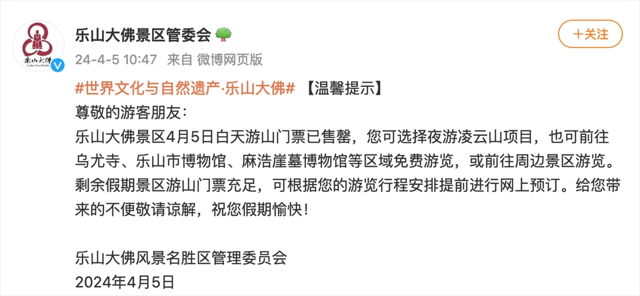 而據(jù)樂山大佛景區(qū)管委會發(fā)布的公告,4月4日15:04,樂山大佛景區(qū)當(dāng)日的白天游山門票已售罄;4月5日10:47,樂山大佛景區(qū)當(dāng)日的白天游山門票就已售罄。