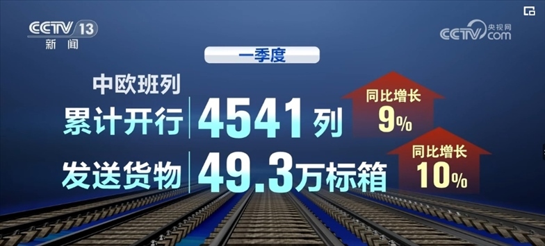 數(shù)據(jù)顯示,一季度中,歐班列累計(jì)開(kāi)行4541列,發(fā)送貨物49.3萬(wàn)標(biāo)箱,同比分別增長(zhǎng)9%、10%。