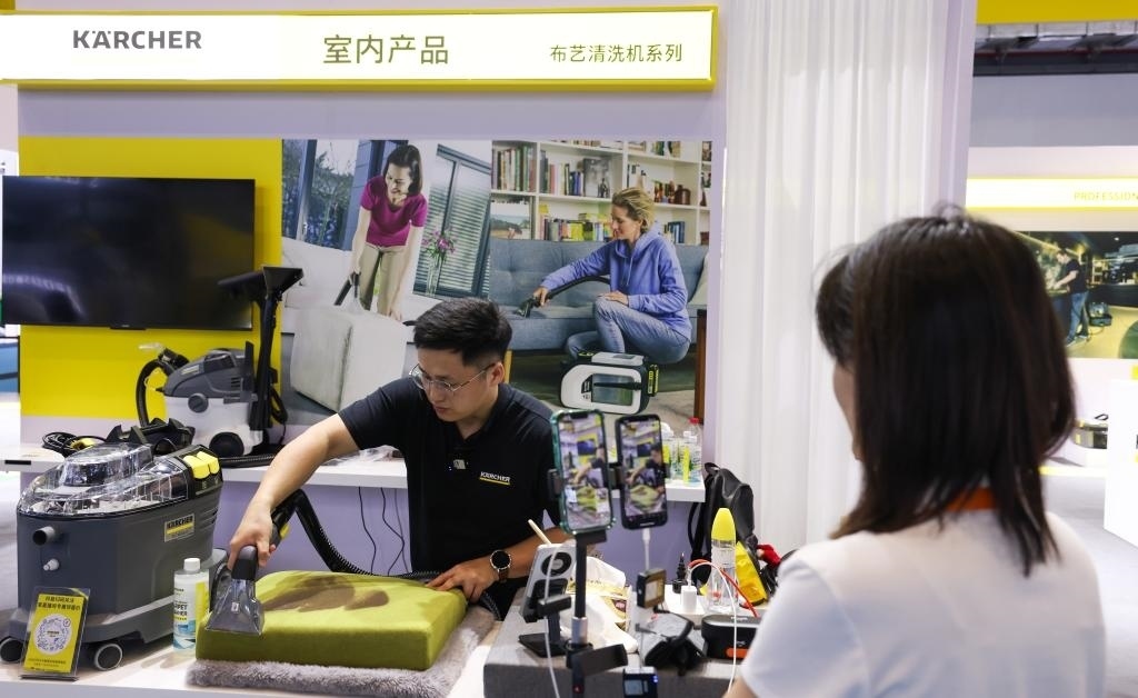 “友友們,現(xiàn)在進入‘云’逛消博會時間,大家可以通過直播試擦,感受這款鏡面清潔機的功能?!币贿呍谡古_發(fā)布新品,一邊引導消費者進入直播間購買,卡赫現(xiàn)場工作人員陳女士忙得不亦樂乎。據(jù)她介紹,這是公司第一次在消博會上使用直播帶貨形式,“效果不錯,剛剛就有不少粉絲下單”。