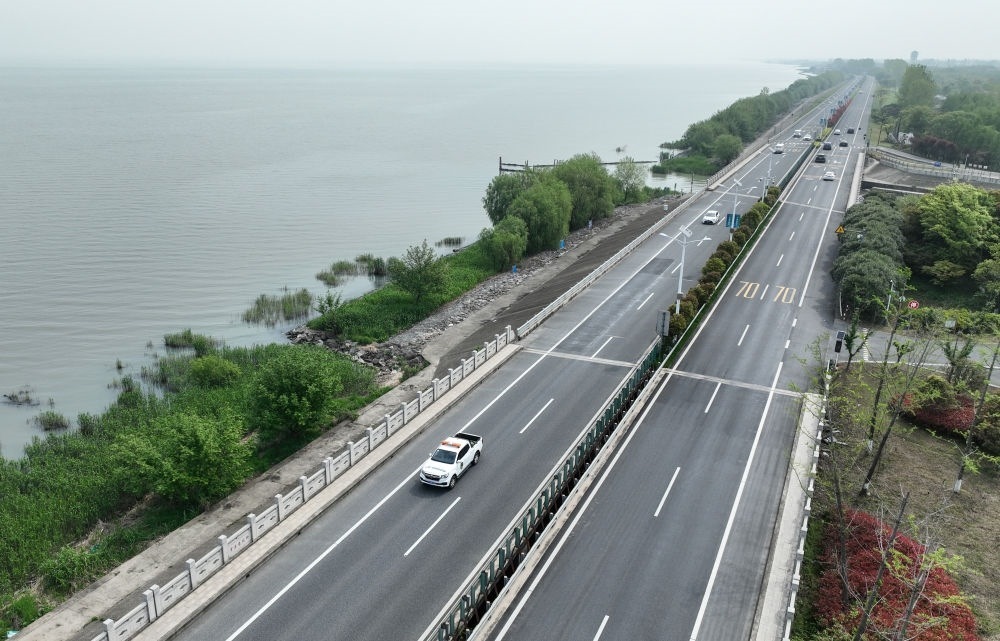 2024年4月11日,浙江省湖州市吳興區(qū)綜合行政執(zhí)法局高新區(qū)中隊(duì)執(zhí)法人員駕車在太湖沿岸巡查(無人機(jī)照片)。