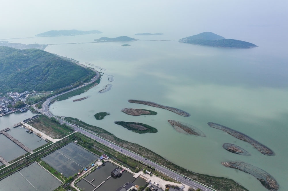 這是江蘇省蘇州市吳中區(qū)金庭鎮(zhèn)環(huán)太湖濕地帶修復(fù)項(xiàng)目(2024年4月11日攝,無人機(jī)照片)。