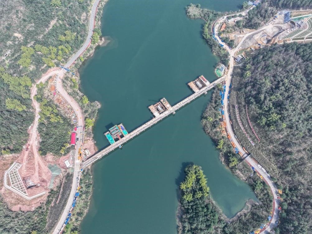 這是2月19日拍攝的位于重慶市銅梁區(qū)的成渝中線高鐵玄天湖大橋建設(shè)現(xiàn)場(chǎng)(無(wú)人機(jī)照片)。新華社記者 唐奕 攝