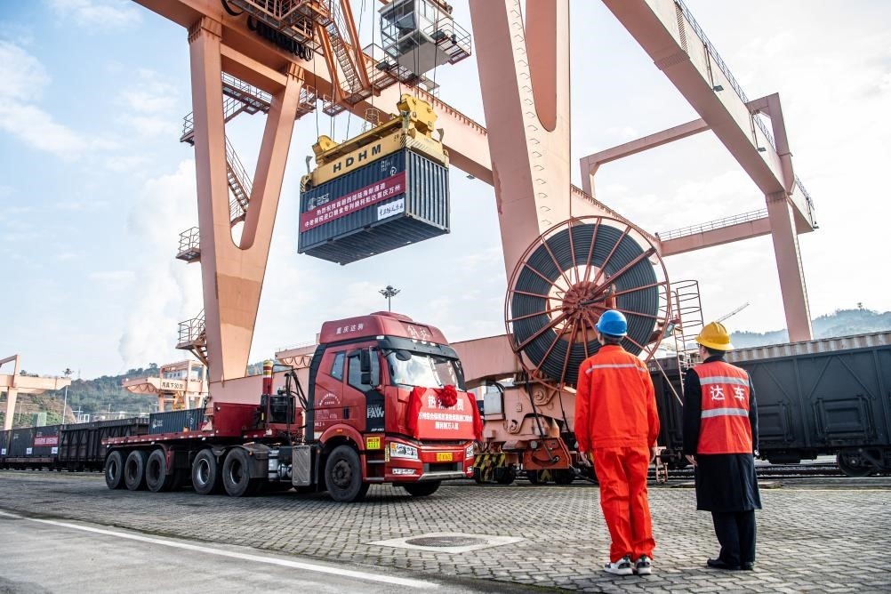 1月4日,在重慶萬(wàn)州新田港站,工作人員進(jìn)行集裝箱吊裝作業(yè),將專列貨物轉(zhuǎn)運(yùn)至公路物流環(huán)節(jié)。新華社記者 唐奕 攝