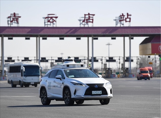 一輛自動(dòng)駕駛車行駛在北京大興國際機(jī)場到亦莊的自動(dòng)駕駛線路上(2024年3月1日攝)。新華社記者 鞠煥宗攝