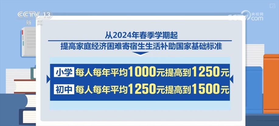 具體來(lái)看,此次下達(dá)資金用于提高家庭經(jīng)濟(jì)困難學(xué)生生活補(bǔ)助標(biāo)準(zhǔn)。從2024年春季學(xué)期起提高家庭經(jīng)濟(jì)困難寄宿生生活補(bǔ)助國(guó)家基礎(chǔ)標(biāo)準(zhǔn),小學(xué)由每人每年平均1000元提高到1250元,初中由每人每年平均1250元提高到1500元,家庭經(jīng)濟(jì)困難非寄宿生生活補(bǔ)助標(biāo)準(zhǔn)繼續(xù)按寄宿生生活補(bǔ)助國(guó)家基礎(chǔ)標(biāo)準(zhǔn)的50%核定,預(yù)計(jì)全國(guó)超過(guò)2000萬(wàn)學(xué)生獲得生活補(bǔ)助。