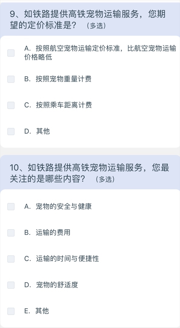 5月10日上午8點(diǎn)40分,澎湃新聞記者通過掃描網(wǎng)友分享的列車上的二維碼,進(jìn)入12306系統(tǒng),選擇問卷·建議,進(jìn)入“鐵路旅客高鐵寵物運(yùn)輸”調(diào)查,共15個問題,涉及養(yǎng)寵類型、是否有攜帶寵物出行的需求、如果鐵路提供寵物運(yùn)輸服務(wù)是否愿意嘗試等,以及為降低對其他旅客的影響,在高鐵寵物運(yùn)輸更關(guān)注哪方面的防護(hù);如鐵路提供高鐵寵物運(yùn)輸服務(wù),期望的定價標(biāo)準(zhǔn);如鐵路提供高鐵寵物運(yùn)輸服務(wù),最關(guān)注的內(nèi)容;如果是非養(yǎng)寵人士,對高鐵寵物運(yùn)輸有何建議等多方面問題。
