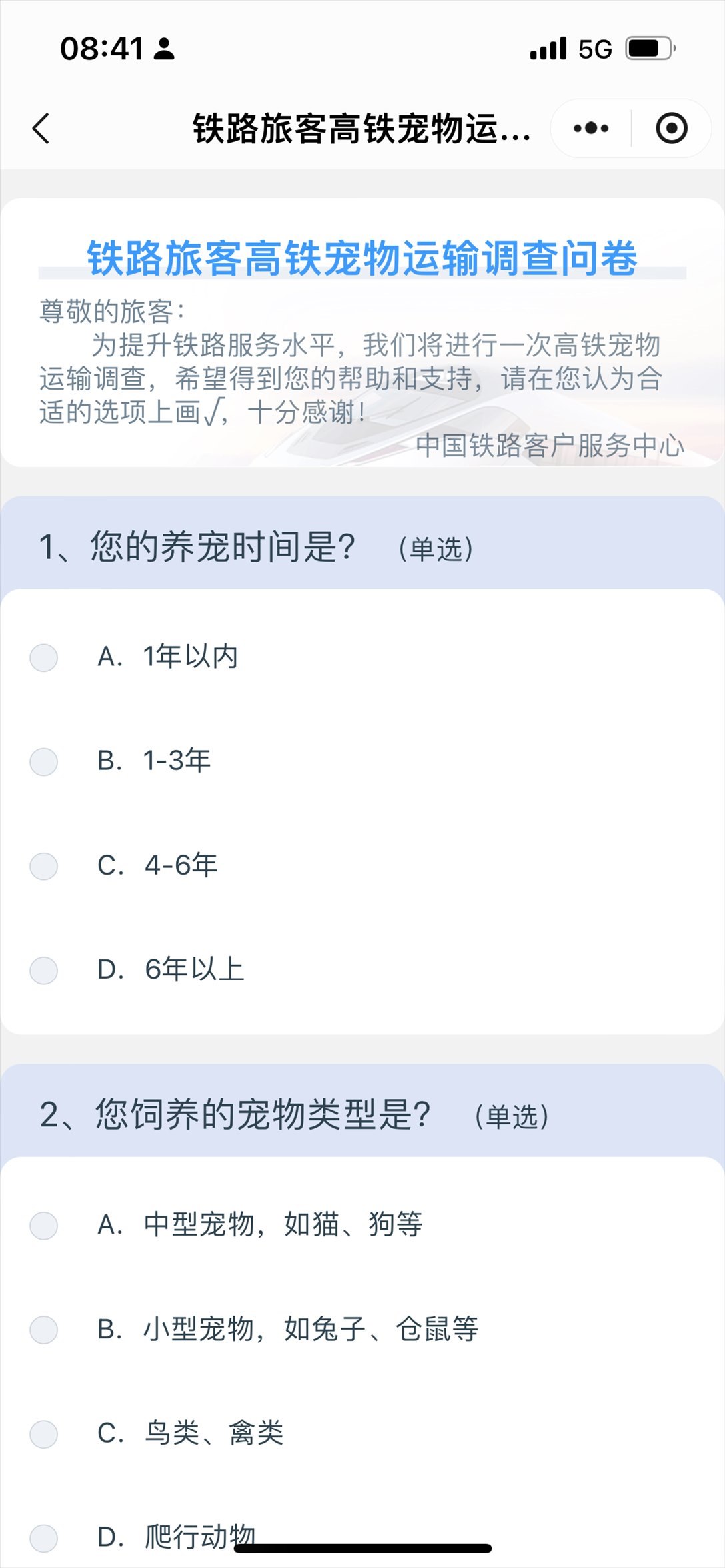 近日,中國鐵路客戶服務(wù)中心推出高鐵寵物運(yùn)輸調(diào)查問卷,澎湃新聞記者注意到,問卷位于12306系統(tǒng)內(nèi),涉及養(yǎng)寵類型、是否愿意嘗試高鐵寵物運(yùn)輸、定價標(biāo)準(zhǔn)、非養(yǎng)寵人士有何建議等15個問題。