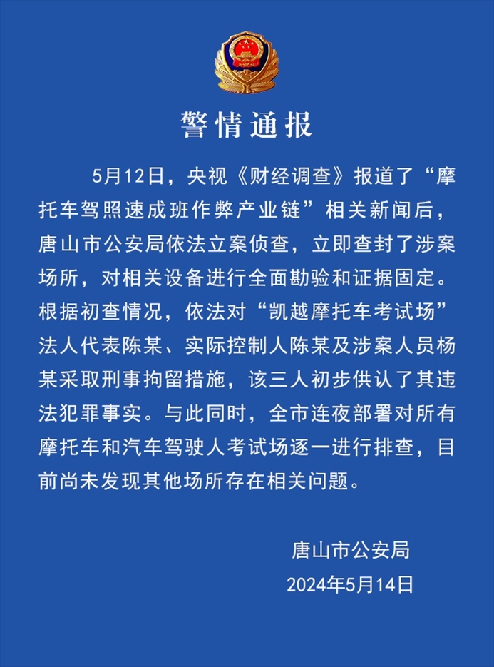 ·唐山警方通報(bào)“摩托車駕照速成班作弊產(chǎn)業(yè)鏈”:3人被刑拘。