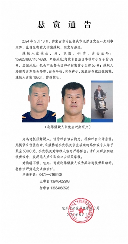 ·內(nèi)蒙古包頭發(fā)生一起刑事案件,警方懸賞5萬(wàn)緝兇。