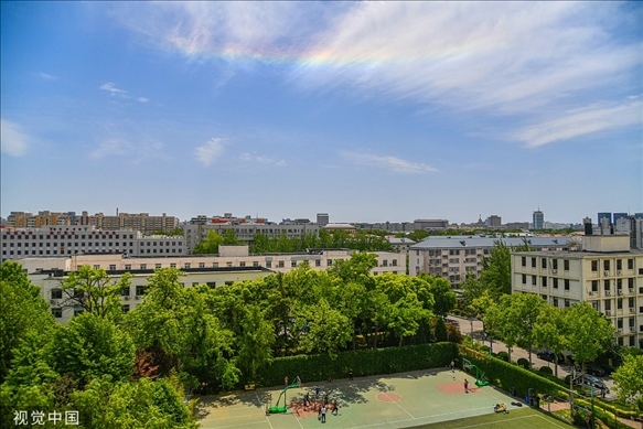 5月14日中午,北京南方天空出現(xiàn)罕見(jiàn)的環(huán)地平弧天象,彩虹一般的七彩祥云下市民正在球場(chǎng)上運(yùn)動(dòng)。