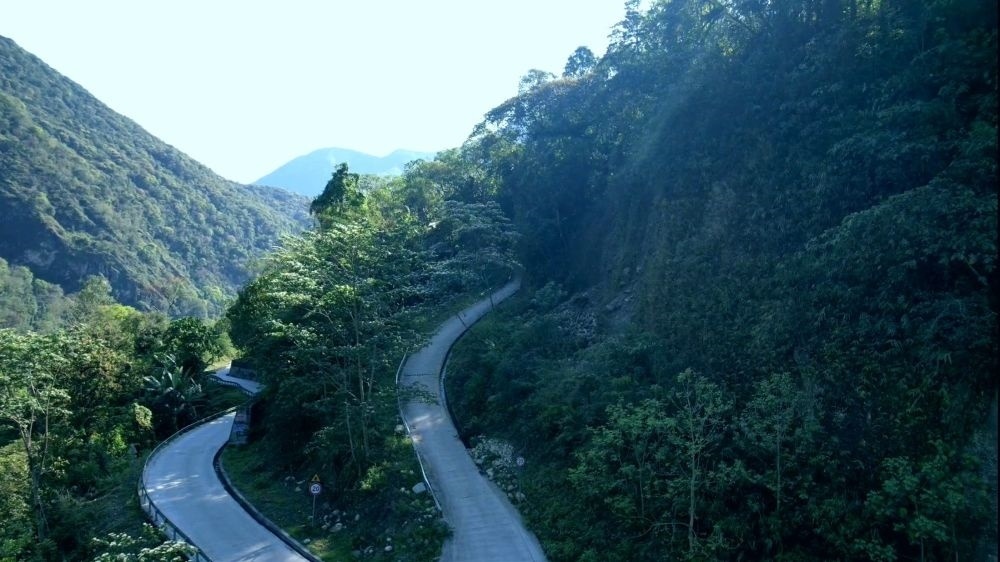 茶場(chǎng)道路順著山谷延伸,像一條絲帶纏繞在翠綠的山上,與國道559線扎墨段(即