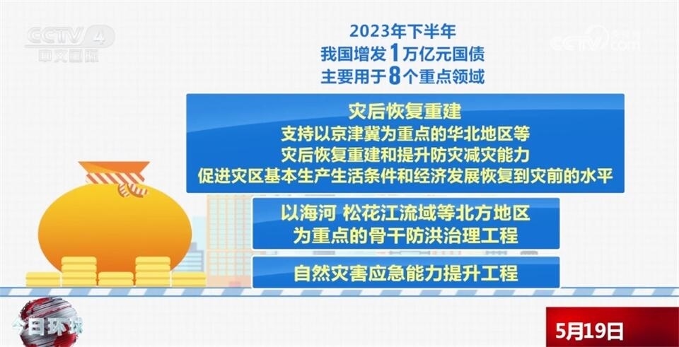 去年下半年,我國(guó)增發(fā)了1萬(wàn)億元國(guó)債,主要用于8個(gè)重點(diǎn)領(lǐng)域,包括災(zāi)后恢復(fù)重建,支持以京津冀為重點(diǎn)的華北地區(qū)等災(zāi)后恢復(fù)重建和提升防災(zāi)減災(zāi)能力,促進(jìn)災(zāi)區(qū)基本生產(chǎn)生活條件和經(jīng)濟(jì)發(fā)展恢復(fù)到災(zāi)前的水平,以海河、松花江流域等北方地區(qū)為重點(diǎn)的骨干防洪治理工程,自然災(zāi)害應(yīng)急能力提升工程,其他重點(diǎn)防洪工程,灌區(qū)建設(shè)改造和重點(diǎn)水土流失治理工程,城市排水防澇能力提升行動(dòng),重點(diǎn)自然災(zāi)害綜合防治體系建設(shè)工程,東北地區(qū)和京津冀受災(zāi)地區(qū)等高標(biāo)準(zhǔn)農(nóng)田建設(shè)。