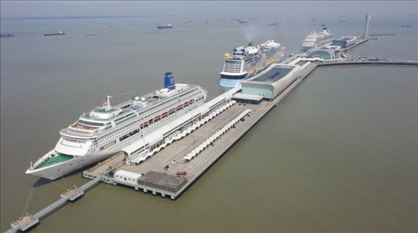 5月22日,“愛達·魔都號”“海洋光譜號”和“鼓浪嶼號”三艘郵輪??吭趨卿量趪H郵輪港(無人機照片)。(上海邊檢總站供圖)
