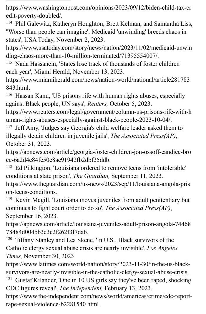 少年司法系統(tǒng)中的兒童遭受不人道待遇。2023年10月,聯(lián)合國人權(quán)理事會在執(zhí)法工作中推進種族正義和平等的國際獨立專家機制調(diào)查顯示,美國刑事司法系統(tǒng)充斥著某些特有的不人道做法。美國是世界上唯一一個判處兒童終身監(jiān)禁不得假釋的國家。(注116)在佐治亞州,兒童福利機構(gòu)的負責人要求法官將有精神問題和行為問題的兒童拘留在少年監(jiān)獄。(注117)自2022年10月以來,多達80名兒童被帶到路易斯安那州以暴力著稱的安哥拉監(jiān)獄,關(guān)押在死刑犯等待處決的牢房里。(注118)盡管這些兒童與成年囚犯隔離,但他們遭受了危險的熱浪,長時間被關(guān)在牢里,使用的是污水,更無法獲得教育。(注119)