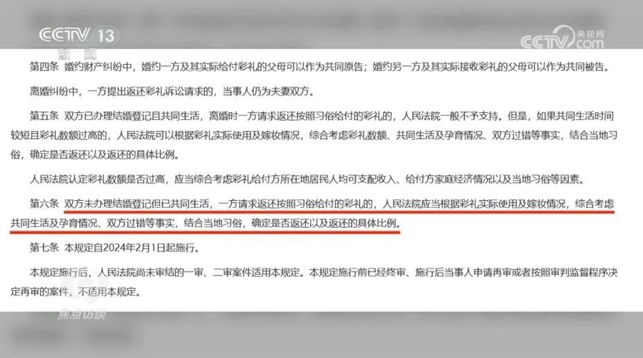 陜西省韓城市人民法院芝陽人民法庭庭長王春妮:“我們跟原告充分釋法明理,讓他知道咱們國家有新的規(guī)定,對他經(jīng)過反復(fù)做工作,他也降低了自己的心理預(yù)期。被告這邊認(rèn)為我跟你在一起共同生活了,我也是實(shí)心想跟你過日子,但是因?yàn)闆]有領(lǐng)證,而且我還跟你共同生育了一個(gè)孩子,你現(xiàn)在要求我給你返還彩禮,我就不愿意返還,心里有抵抗情緒。”