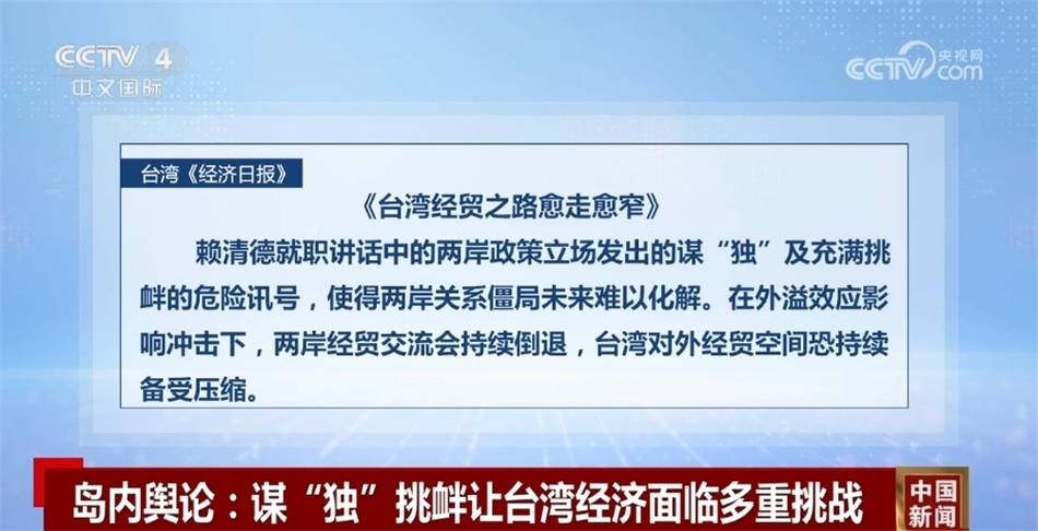 臺灣《經(jīng)濟日報》近日發(fā)表題為《臺灣經(jīng)貿(mào)之路愈走愈窄》的社論指出,賴清德就職講話中的兩岸政策立場發(fā)出的謀“獨”及充滿挑釁的危險訊號,使得兩岸關(guān)系僵局未來難以化解。在外溢效應(yīng)影響沖擊下,兩岸經(jīng)貿(mào)交流會持續(xù)倒退,臺灣對外經(jīng)貿(mào)空間恐持續(xù)備受壓縮。
