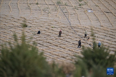 在其白線沙地綜合治理工程項目區(qū),記者跟隨治沙隊伍在松軟的沙丘上迎坡徒步前行,每走一步,退后半步,沙粒灌滿鞋履。然而,來自當(dāng)?shù)氐闹紊橙罕妳s早已習(xí)慣,他們兩三人一組,配合默契,有人拉著稻草橫放鋪平,有人則用工具按壓培土,還有人跟在后面,在鋪好的草方格里撒下草籽。“最高峰的時候每天有上千人參與治沙,推進(jìn)速度很快?!眲h(huán)宇介紹,今年以來全旗已完成26.5萬畝的治沙任務(wù)。