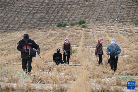 在內(nèi)蒙古赤峰市翁牛特旗巴彥呼交嘎查其白線防沙治沙項目區(qū),治沙工人在拉滴灌帶。新華社記者 連振 攝