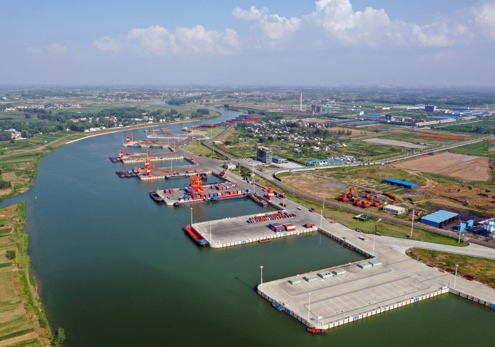 2022年6月28日拍攝的河南周口中心港碼頭(無人機照片)。近年來,河南積極推進沙潁河航道升級改造,疏通內(nèi)河航運。現(xiàn)在,從周口中心港出發(fā)的船舶可經(jīng)沙潁河至淮河、京杭大運河駛?cè)腴L江,讓內(nèi)陸城市亦能通江達海。