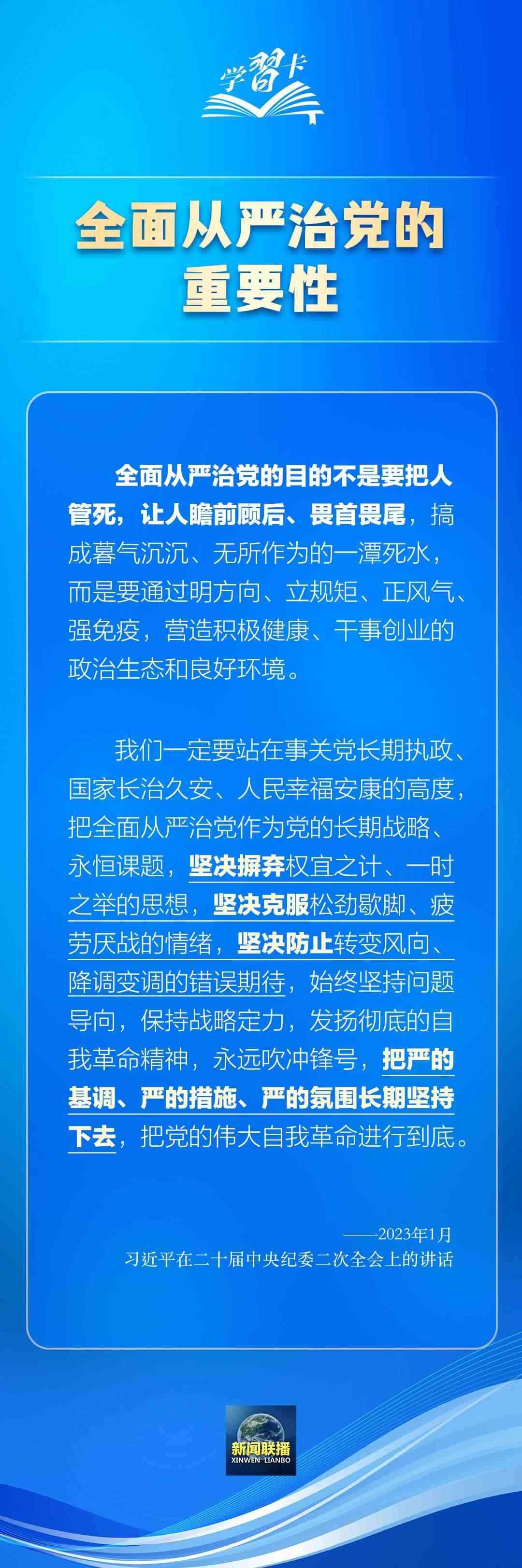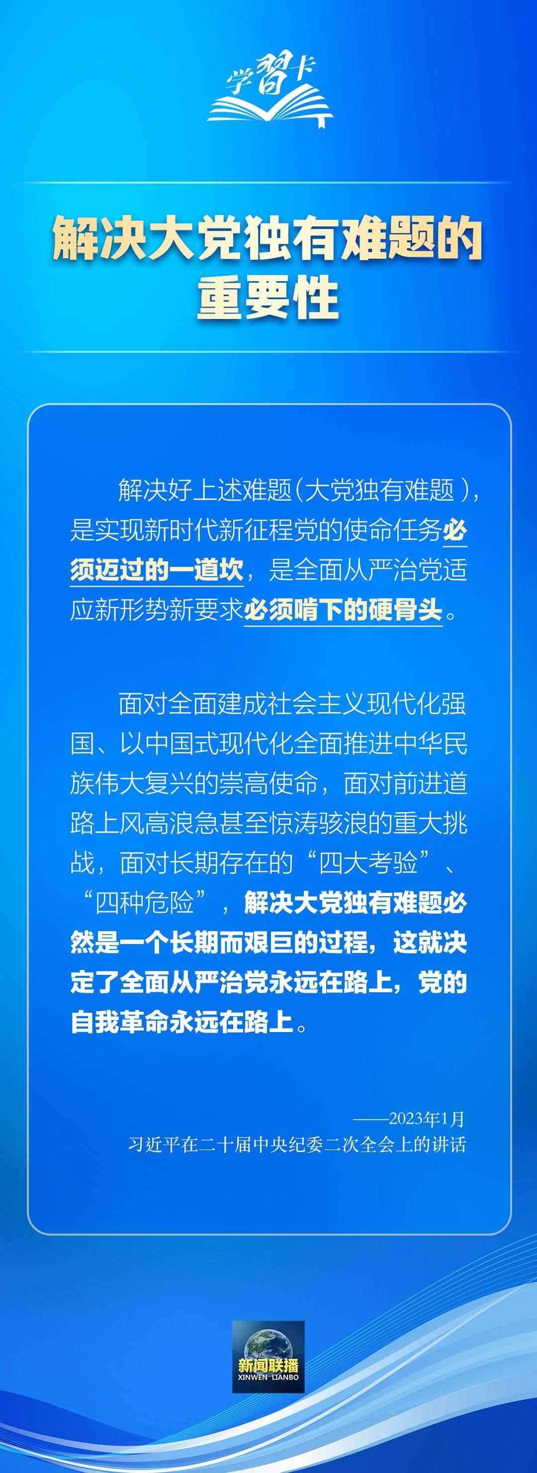 習(xí)近平總書記在不同場合多次強調(diào)全面從嚴治黨、黨的自我革命的重要性。解決好大黨獨有難題,是實現(xiàn)新時代新征程黨的使命任務(wù)必須邁過的一道坎,是全面從嚴治黨適應(yīng)新形勢新要求必須啃下的硬骨頭。
