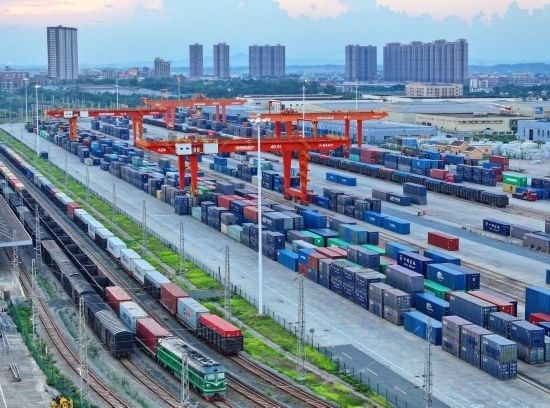 9月4日,江西省贛州市南康區(qū)贛州國際陸港貨場,集裝箱整齊排列,進出口貨物正快速有序裝卸。(受訪者供圖)
