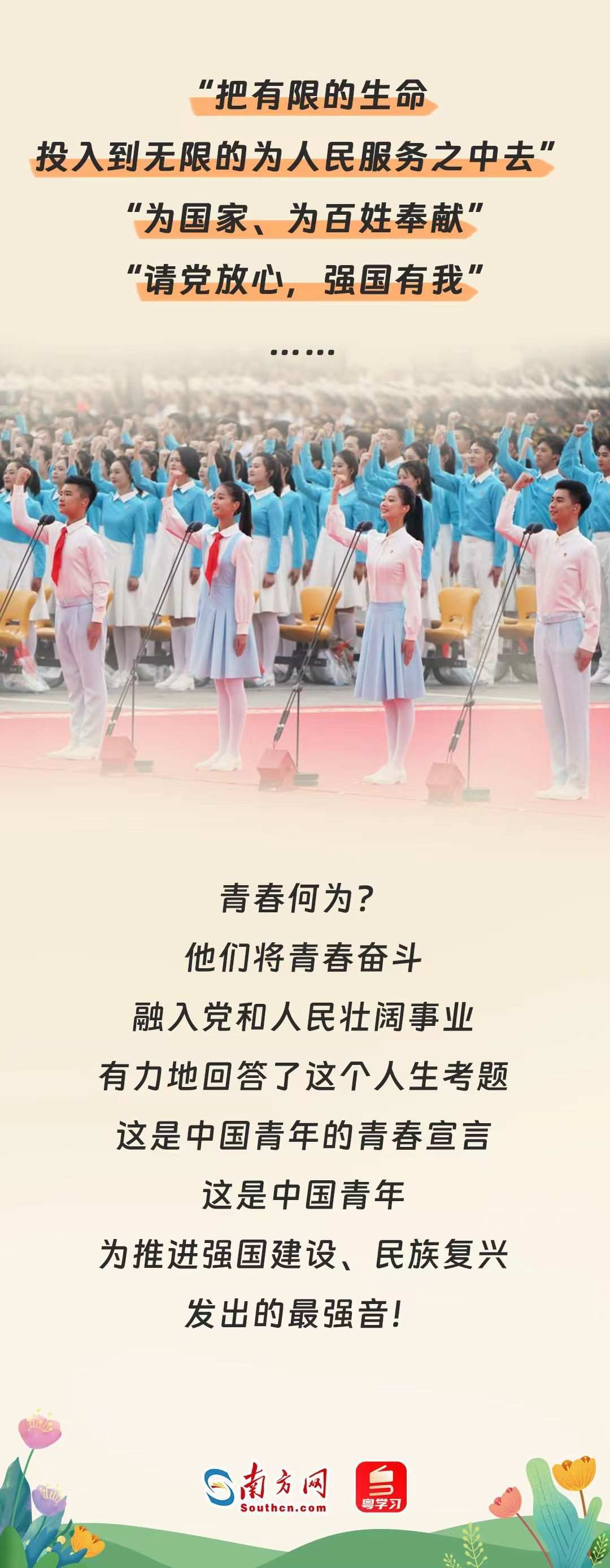 時(shí)代的每一次前行,都閃耀著青年奮勇拼搏的身影。一代又一代的中國青年滿懷對(duì)祖國和人民的赤子之心,積極投身黨領(lǐng)導(dǎo)的偉大事業(yè),為人民戰(zhàn)斗、為祖國獻(xiàn)身、為幸福生活?yuàn)^斗,用行動(dòng)奮力踐行著自己的青春宣言。