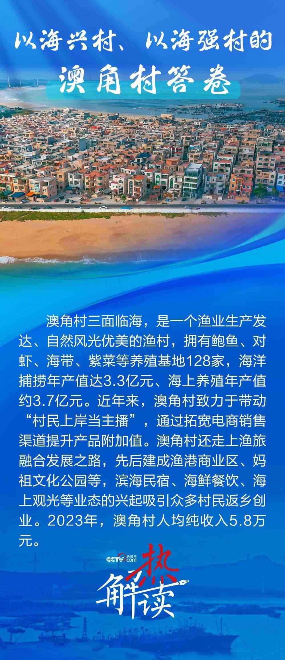 澳角村三面臨海,近年來走出了一條以海興村、以海強村的新路子??吹洁l(xiāng)村發(fā)生了巨變,總書記直言“鄉(xiāng)村振興還是要發(fā)揚優(yōu)勢”,并勉勵澳角村做好“?!钡奈恼拢卩l(xiāng)村振興、共同富裕的道路上一往無前。