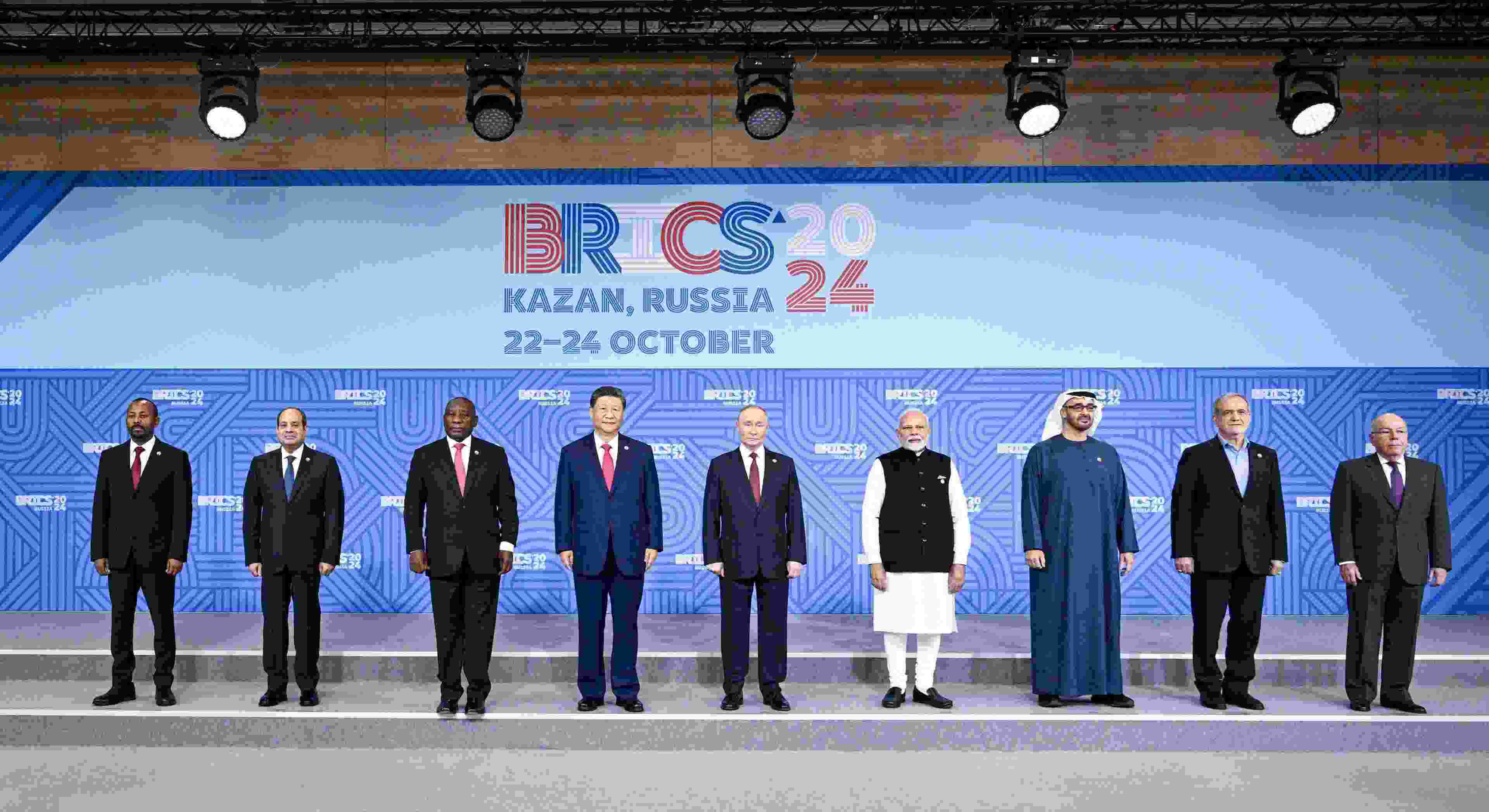 △當?shù)貢r間2024年10月24日上午,國家主席習近平在喀山會展中心出席金磚成員國、嘉賓國領導人和國際組織負責人集體合影。
