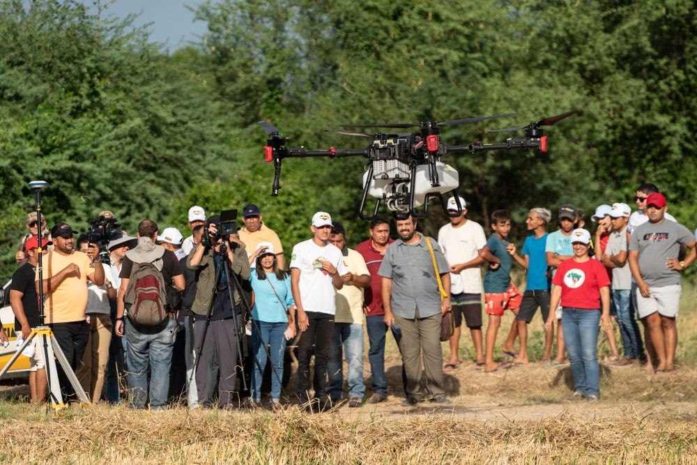 2024年2月2日,中巴農(nóng)業(yè)機(jī)械化合作示范項(xiàng)目啟動(dòng)儀式在巴西阿波迪舉行,第一批來自中國7家農(nóng)機(jī)企業(yè)共31臺(tái)(件)設(shè)備正式交付給巴西農(nóng)村勞動(dòng)者組織。這是人們觀看一款中國生產(chǎn)的農(nóng)用無人機(jī)。