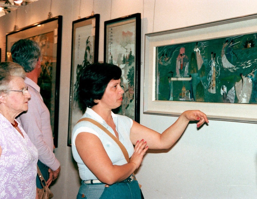 1983年5月24日至7月31日,中國經(jīng)濟(jì)貿(mào)易展覽會(huì)在巴西圣保羅和里約熱內(nèi)盧舉辦。這是巴西觀眾在展覽會(huì)上欣賞貝雕羽毛畫。
