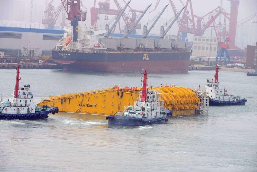 2013年7月15日,出口巴西的深海石油開采浮體在拖船牽引下離開山東青島港碼頭。這套浮體服務(wù)于巴西近海300公里桑托斯盆地的深海油田。