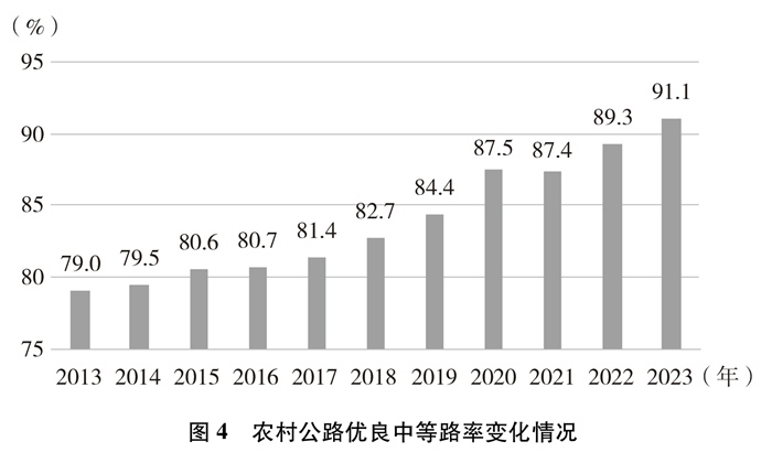 技術(shù)等級逐年提高。截至2023年底,農(nóng)村公路等級路②里程及比例分別達(dá)到445萬公里和96.8%,鋪裝路面里程及比例分別達(dá)到422萬公里和91.8%,十年間分別提高了11.9個百分點、27.2個百分點。