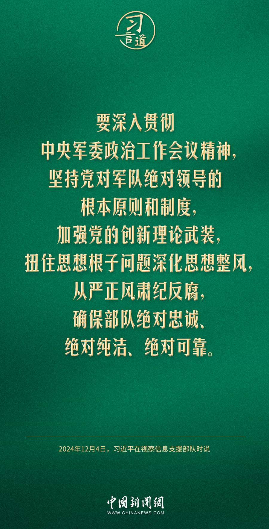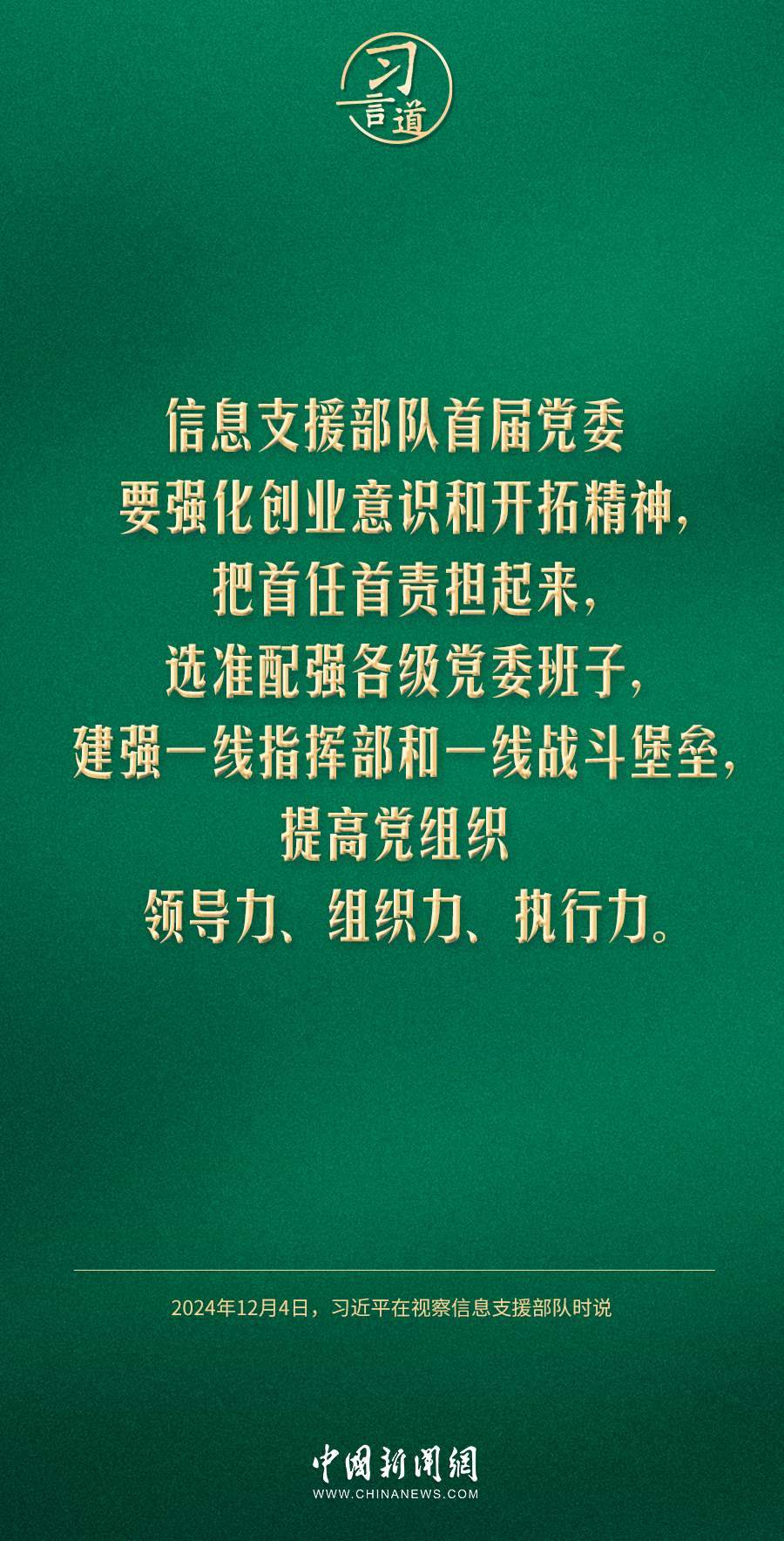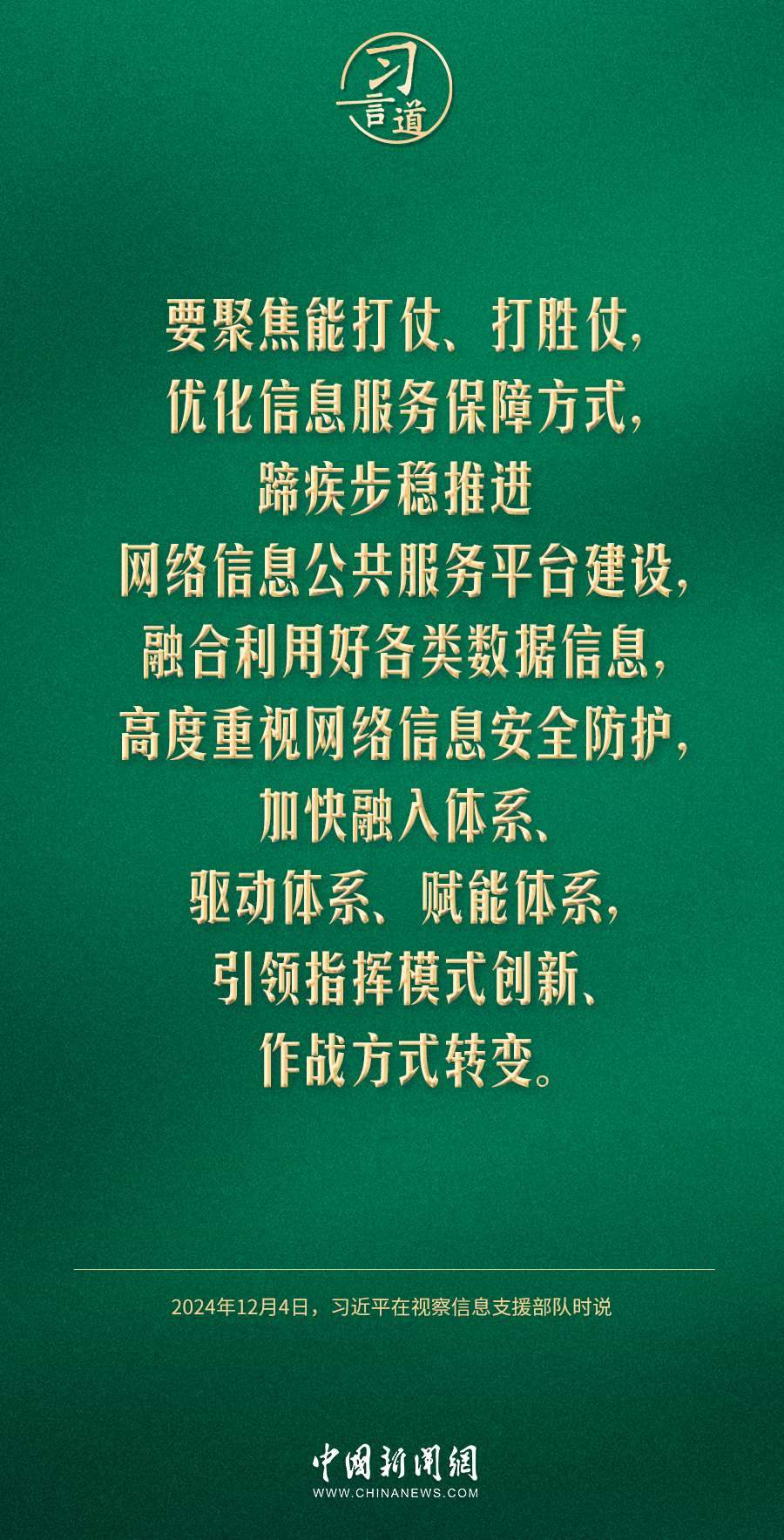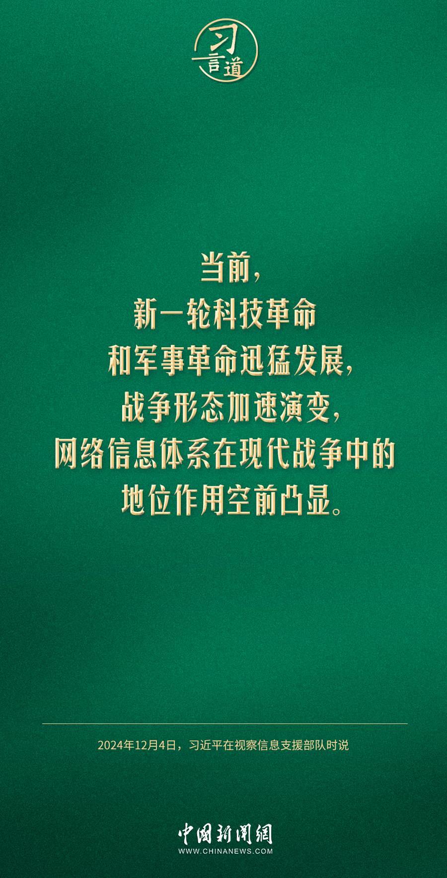 中共中央總書記、國(guó)家主席、中央軍委主席習(xí)近平4日視察信息支援部隊(duì),代表黨中央和中央軍委,對(duì)信息支援部隊(duì)第一次黨代表大會(huì)的召開表示熱烈祝賀,向信息支援部隊(duì)全體官兵致以誠(chéng)摯問候。習(xí)近平指出——