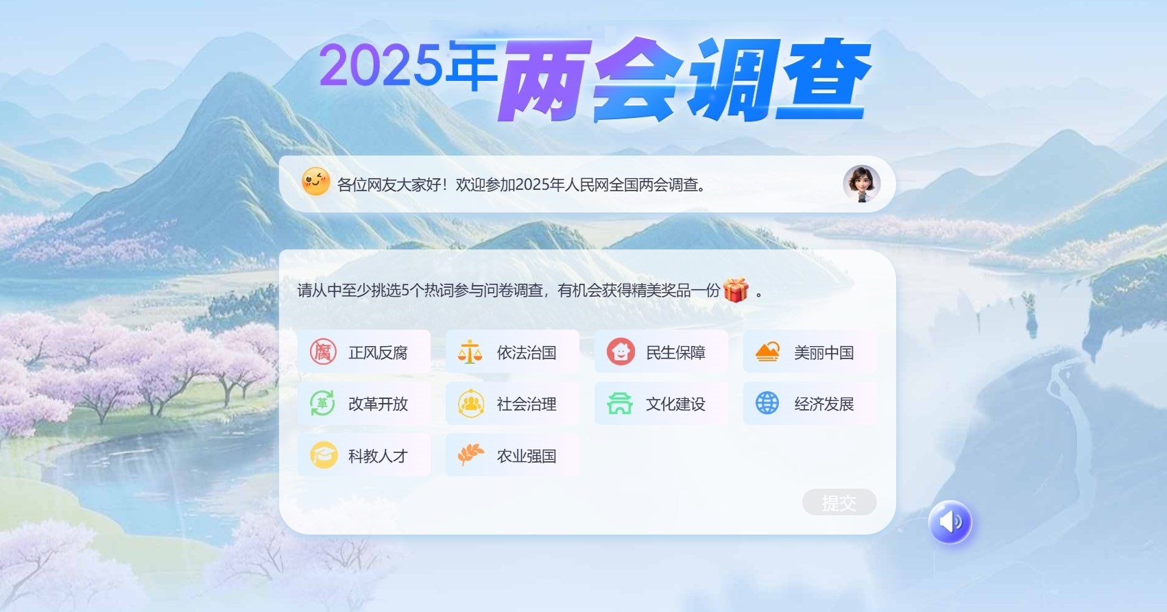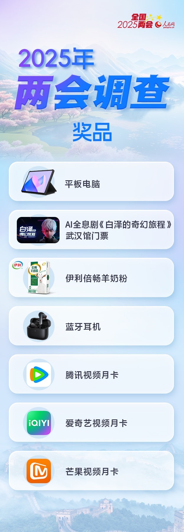 為感謝網(wǎng)友對人民網(wǎng)2025年全國兩會調查的支持,參與者有機會抽取精美獎品1份。