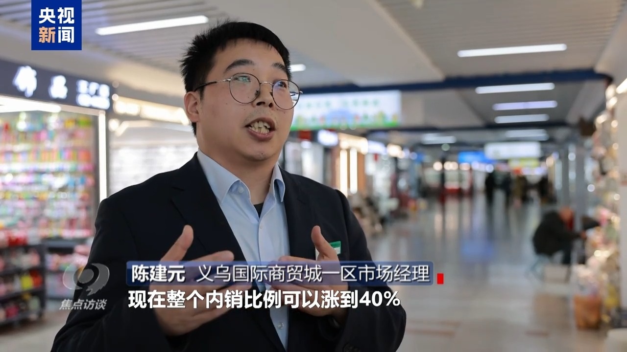 義烏國(guó)際商貿(mào)城一區(qū)市場(chǎng)經(jīng)理 陳建元:我們有一個(gè)統(tǒng)計(jì),拿我們的飾品行業(yè)來(lái)說(shuō),經(jīng)過(guò)這幾年培育,直播電商的快速發(fā)展,有些經(jīng)營(yíng)戶轉(zhuǎn)型,現(xiàn)在整個(gè)內(nèi)銷(xiāo)比例可以漲到40%,比例還是有一個(gè)很明顯的提升。