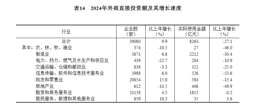 全年新設(shè)外商投資企業(yè)59080家,比上年增長(zhǎng)9.9%。實(shí)際使用外資8263億元,下降27.1%,折1162億美元,下降28.8%。其中,共建“一帶一路”國(guó)家(含通過(guò)部分自由港對(duì)華投資)對(duì)華新設(shè)外商投資企業(yè)17172家,增長(zhǎng)23.8%;對(duì)華直接投資1147億元,下降6.2%,折161億美元,下降8.4%。高技術(shù)產(chǎn)業(yè)實(shí)際使用外資2864億元,下降32.3%,折403億美元,下降34.0%。