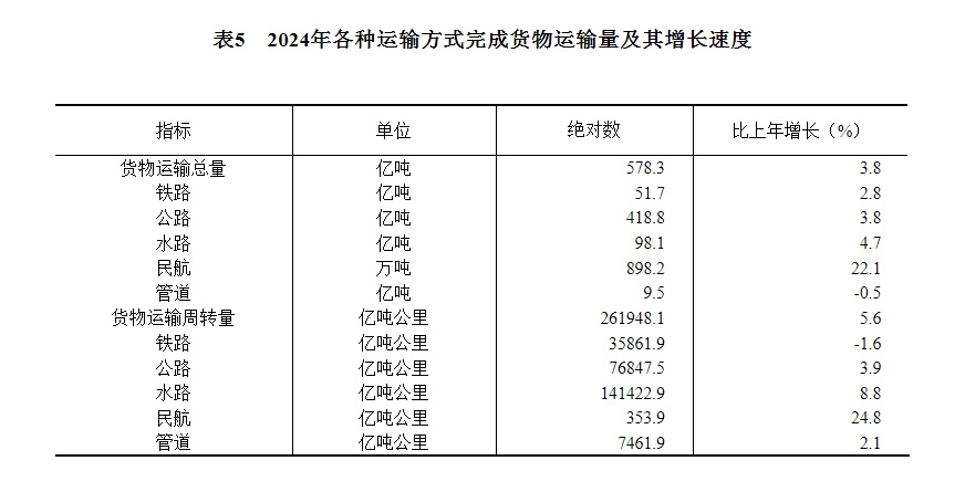 [28]貨物運(yùn)輸總量及周轉(zhuǎn)量包括鐵路、公路、水路、民航和管道五種運(yùn)輸方式完成量,2024年增速按可比口徑計(jì)算。