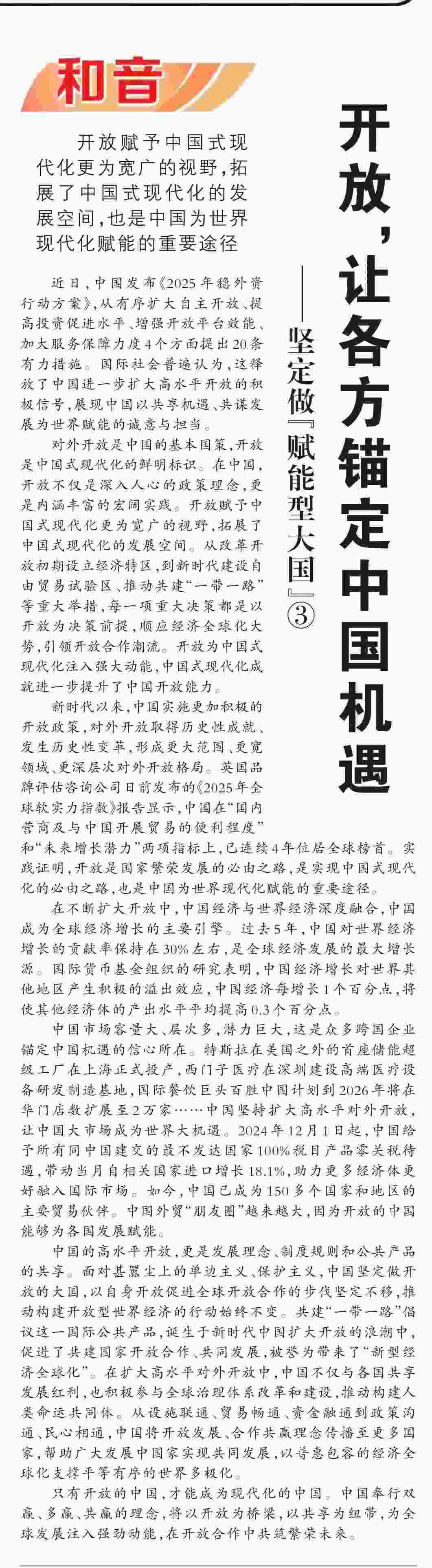 近期,《人民日報》“和音”欄目推出“堅定做‘賦能型大國’”系列評論,圍繞科技創(chuàng)新、開放共贏、綠色轉(zhuǎn)型、高質(zhì)量共建“一帶一路”、多邊治理等熱點議題,從不同角度闡釋中國何以成為一個“賦能型大國”的深層邏輯,展現(xiàn)中國始終秉持構(gòu)建人類命運共同體理念,不斷以中國式現(xiàn)代化為世界現(xiàn)代化賦能的大國擔(dān)當(dāng)。