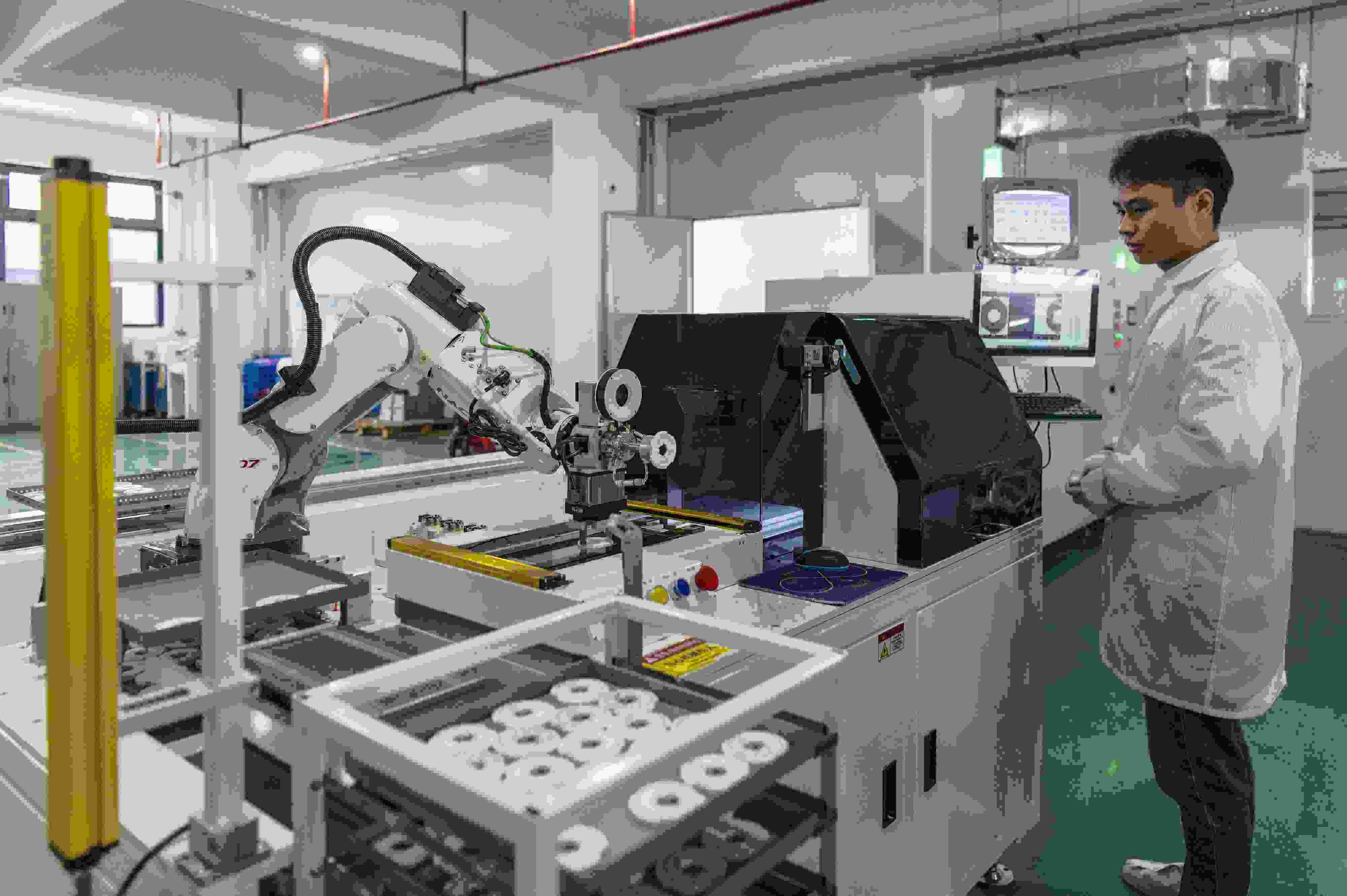 △2025年3月11日,在浙江省金華市浦江三思光電技術(shù)有限公司自動化生產(chǎn)線上,一只只機(jī)械臂靈活運(yùn)轉(zhuǎn)著,趕訂單、忙生產(chǎn)。