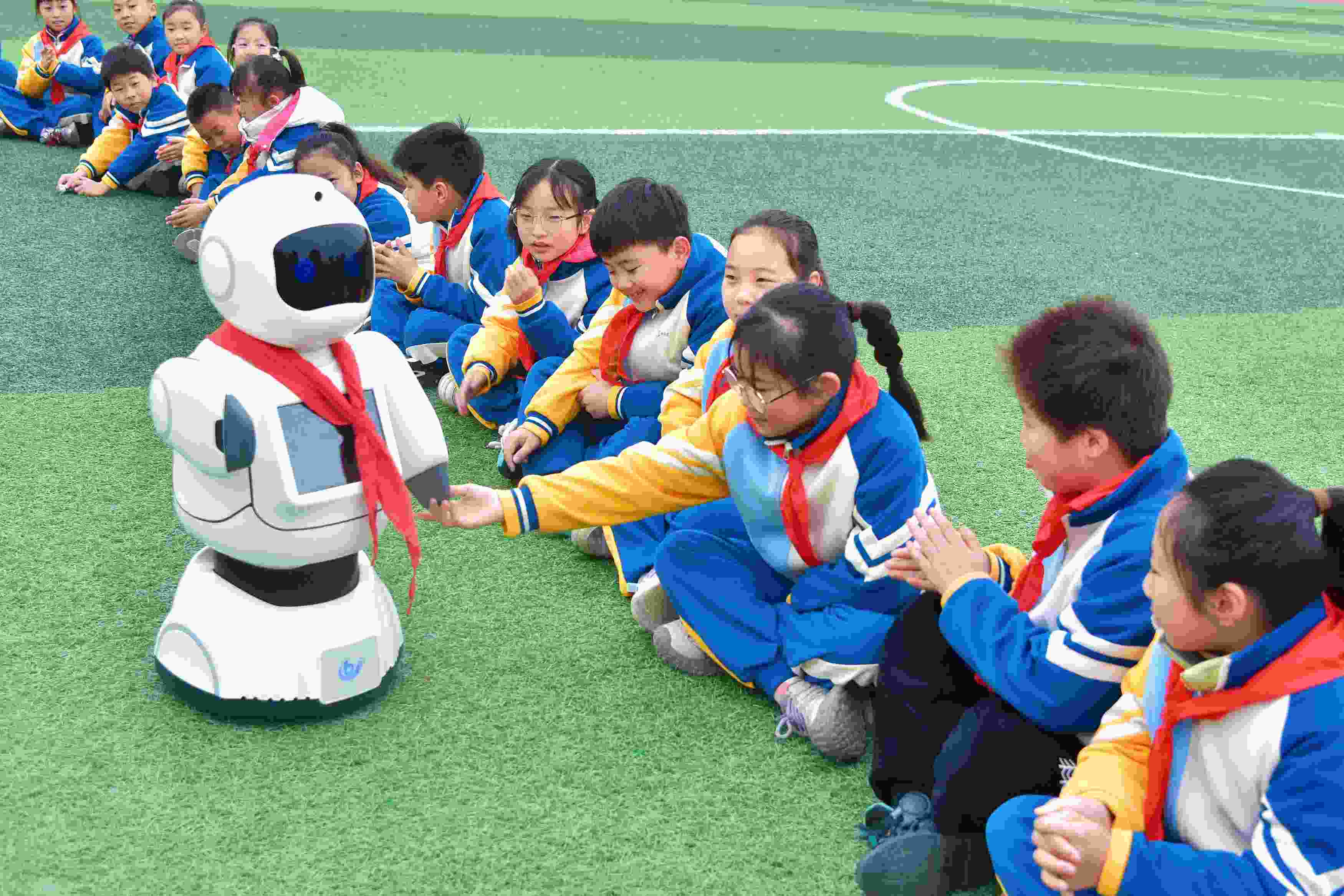 △2025年3月10日,江蘇南通,如皋經(jīng)濟(jì)技術(shù)開發(fā)區(qū)實(shí)驗(yàn)小學(xué)課間,學(xué)生與智能機(jī)器人“賓果”互動。