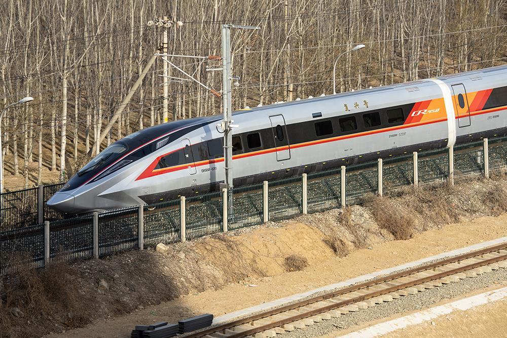 △2025年2月15日,中國鐵道科學(xué)院試驗(yàn)中心環(huán)形試驗(yàn)場,復(fù)興號CR450型電力動車組進(jìn)場展開測試。