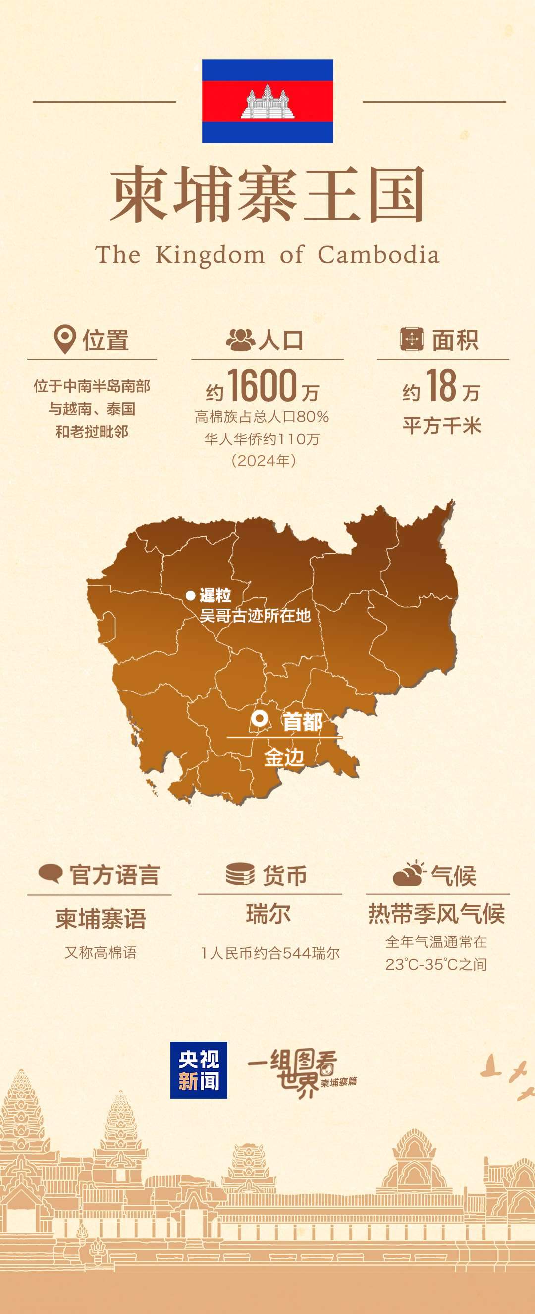 從國旗上的千年古跡吳哥窟,到湄公河畔會“呼吸”的洞里薩湖;從元代周達觀筆下的《真臘風土記》,到與中國結下深厚情誼的西哈努克;從共建“一帶一路”的金港高速公路,到“鉆石六邊”合作架構不斷充實……通過一組圖,帶您了解中國的這個“鐵桿”朋友——柬埔寨↓↓↓