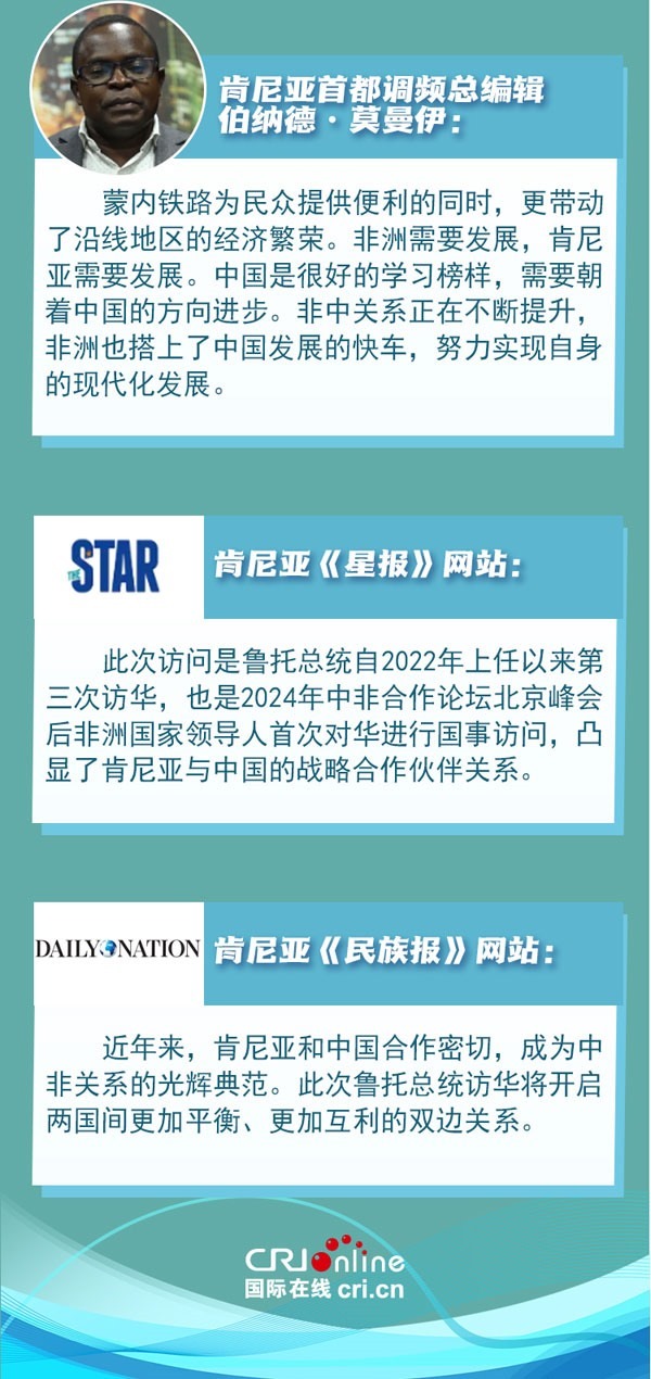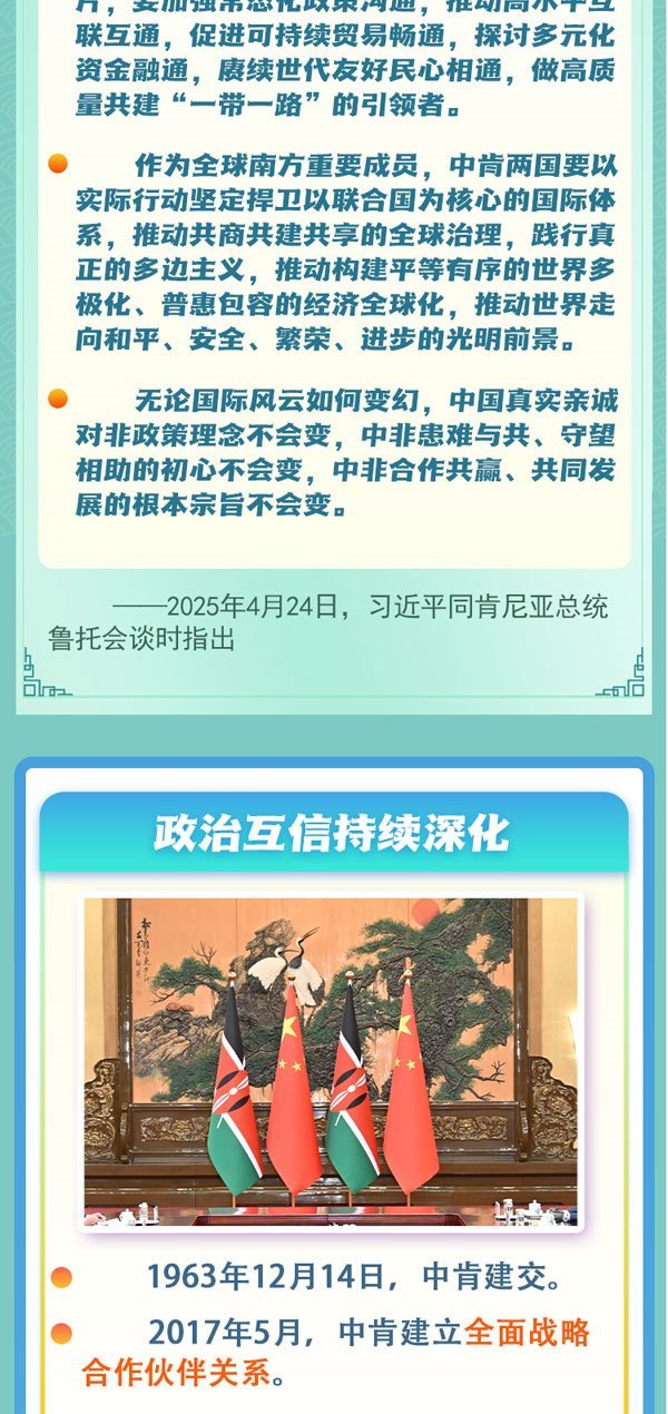 中肯友誼源于古老的海上絲綢之路。新時(shí)代以來中肯兩國高層交往密切,政治互信持續(xù)深化??夏醽喐鹘缯J(rèn)為,肯中合作秉持共同愿景,非洲國家應(yīng)充分發(fā)揮非中合作潛力,攜手建設(shè)更加公平公正、多元繁榮的世界。