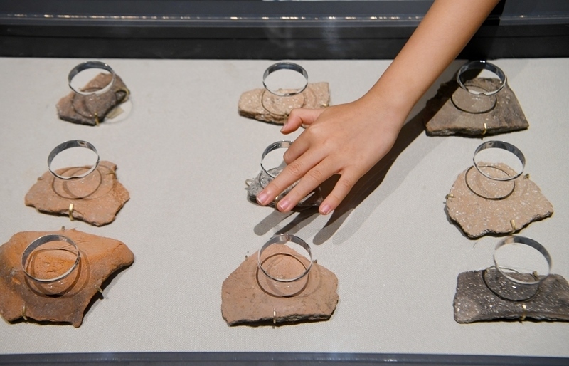 6月14日,參觀者在大河村遺址博物館新館觸摸陶片。